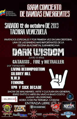 que se llevará acabo el próximo 12 de Octubre de 2013 en la ciudad de San Cristóbal (Estado Táchira) en el Velódromo en el Sector Pueblo Nuevo, donde tendremos las visitas de bandas internacionales de nuestros amigos y hermanos de Colombia por primera vez en el país como lo es la Banda DARK WISDOM fundada desde 2007 en la ciudad de Bogotá y gran representante del Black Metal Latinoamericano, compartiendo tarima con bandas como NARGAROTH , ROTTING CHRIST, NUNSLAUGTHER, IMMORTAL, BORKNAGAR y MOUNTROSITY, al igual las Bandas CATARSIS (BOGOTA), FIRE(PAMPLONA) Y METRALLER (CÚCUTA), serán las que nos acompañarán durante el evento.La coordinación de Medios y Prensa del evento precedida por Irene Kolbe Rey (Directora de Radio Futuro Venezuela) y Jhosman Paredes (Bajista Banda Silbury Hill) tiene el honor de invitar a toda la colectividad Rockera y Metalera del país para asistir al GRAN CONCIERTO DE BANDAS EMERGENTES-TÁCHIRA-12 DE OCTUBRE 2013,